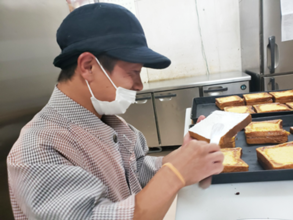 まちなか夢工房では、修業のベーカリー製造・販売と補完的な販売促進業務、Tシャツの制作・販売を通して、就労訓練を提供しています。